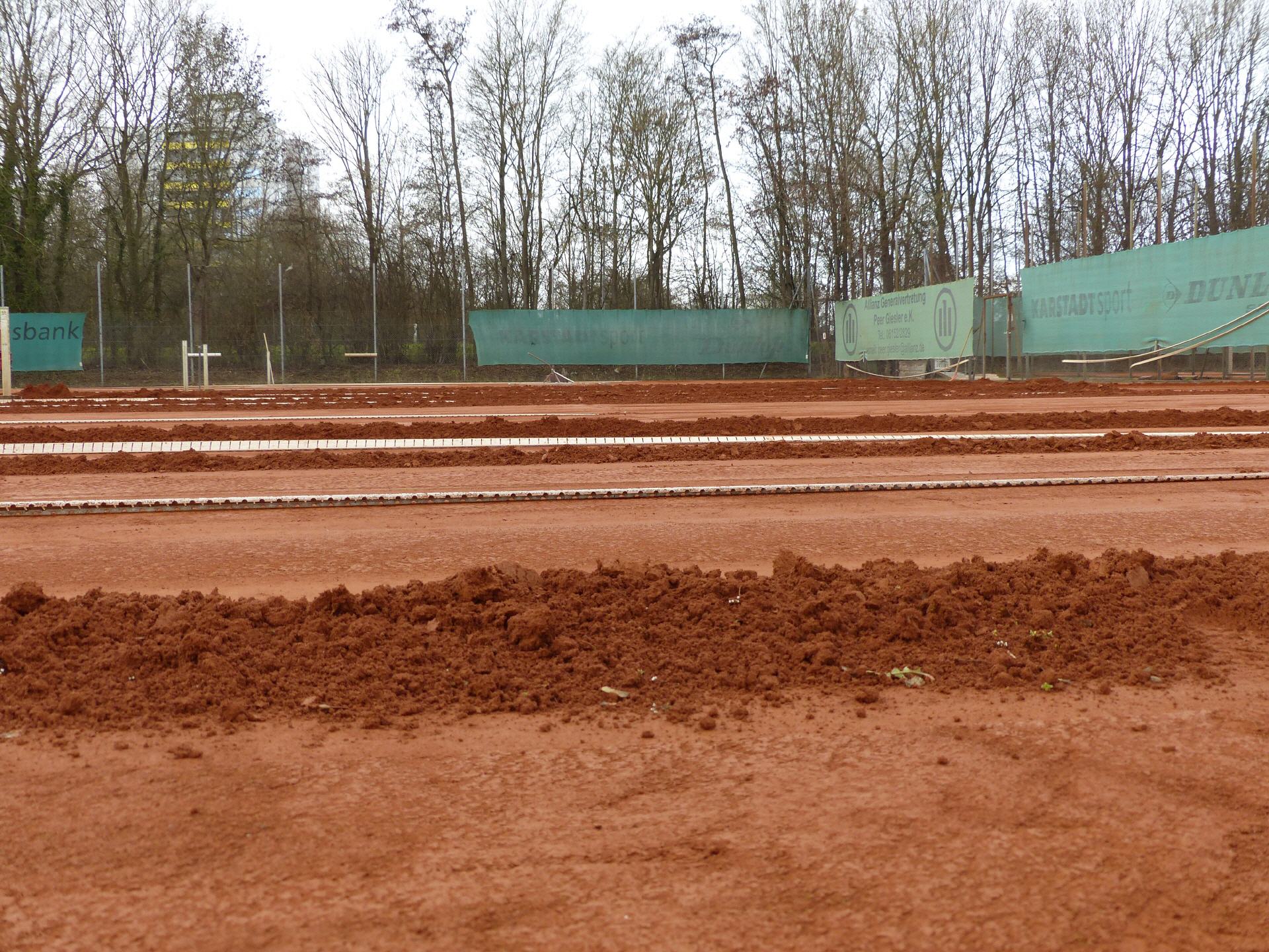 Es war eine ereignisreiche Woche, erst die Vandalen, die auf dem Gelände viel Schaden angerichtet haben, dann mit Verzögerung die Frühjahrs-Instandsetzung durch die Firma Nohe, und zuletzt haben unsere Platzwarte noch die Bäume am Zaun abgeschnitten. Wir hoffen, dass dadurch die Feuchtigkeit auf den Plätzen 1-3 die Plätze besser abtrocknet und außerdem waren mehr als die Hälfte der Bäume schon abgestorben.